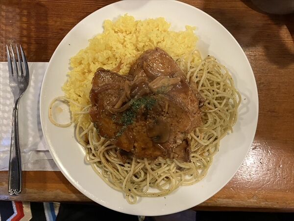 まずは人気イタリアン店タベルナのミートローフ、パスタ、チキンライス、少サラダで1200円